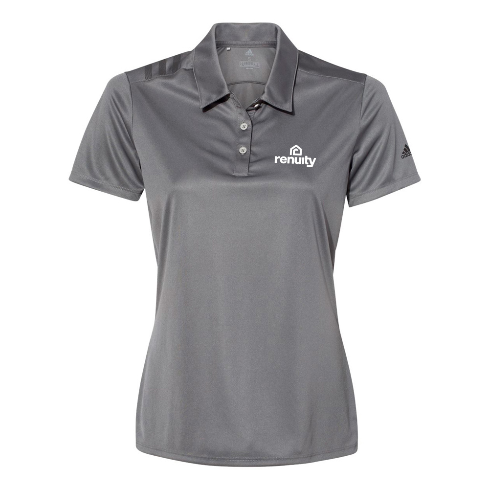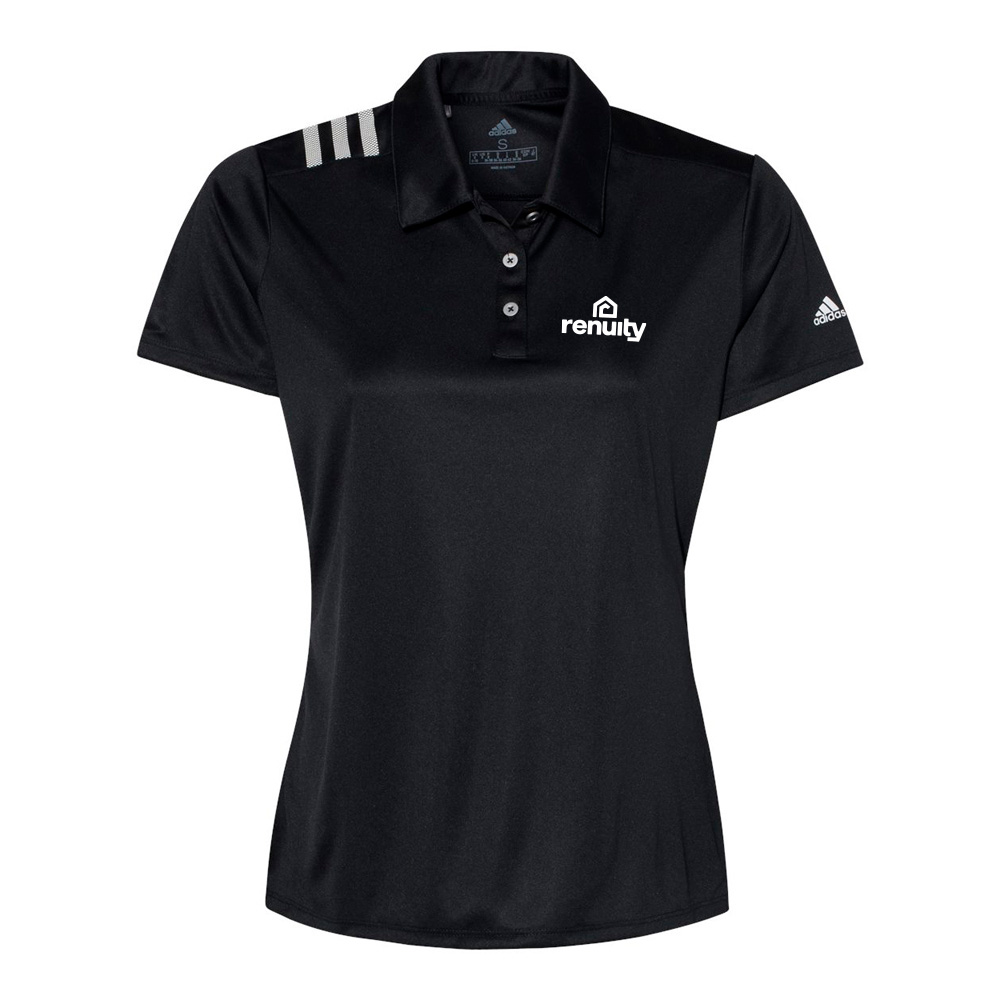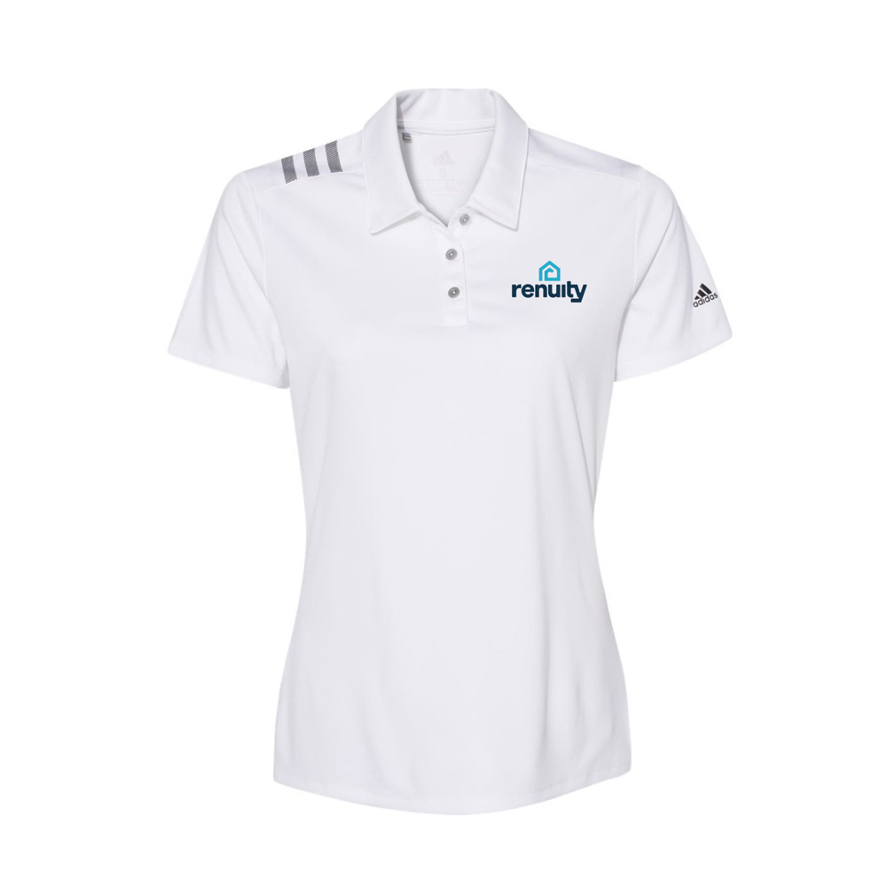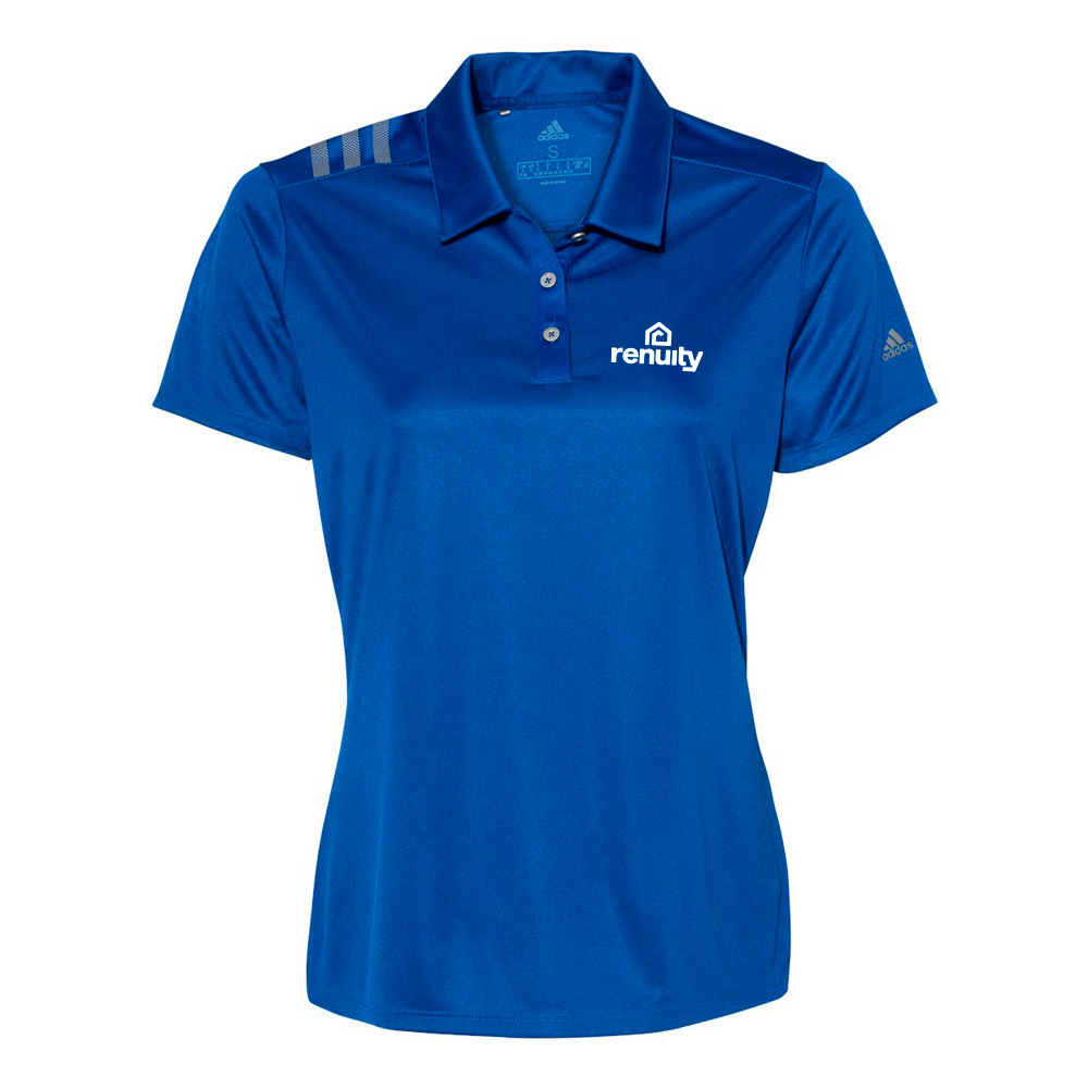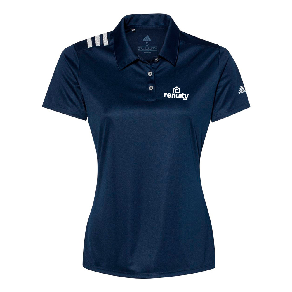 5.3oz 100% Recycled polyester jersey. Hydrophilic finish. Self fabric collar. Three button placket. 3-stripes print on right shoulder. Open hem sleeve. Contrast color Adidas logo on left sleeve. UPS 50+ protection.