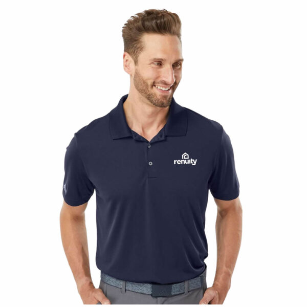 3.8oz 100% Recycled polyester. Hydrophilic finish. Ribbed knit collar with three button placket. UPF 50+ protection. Contrast color heat transfer logo on right sleeve.