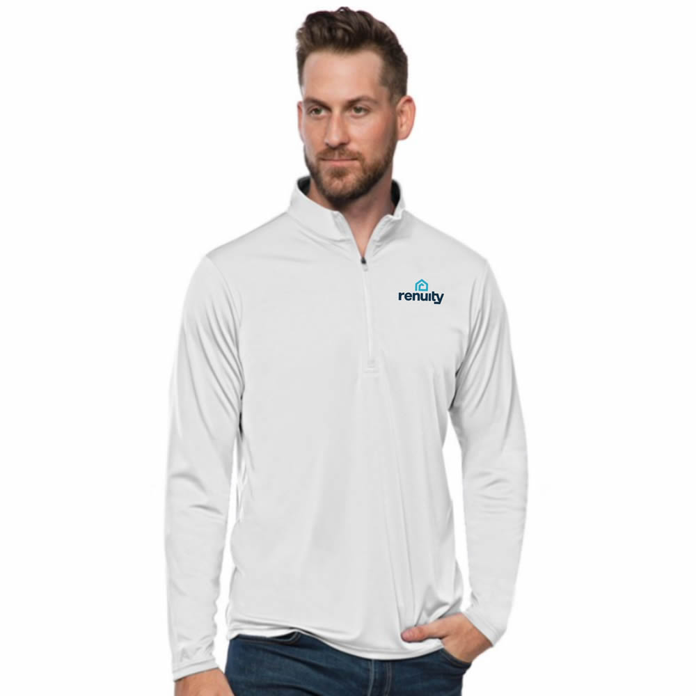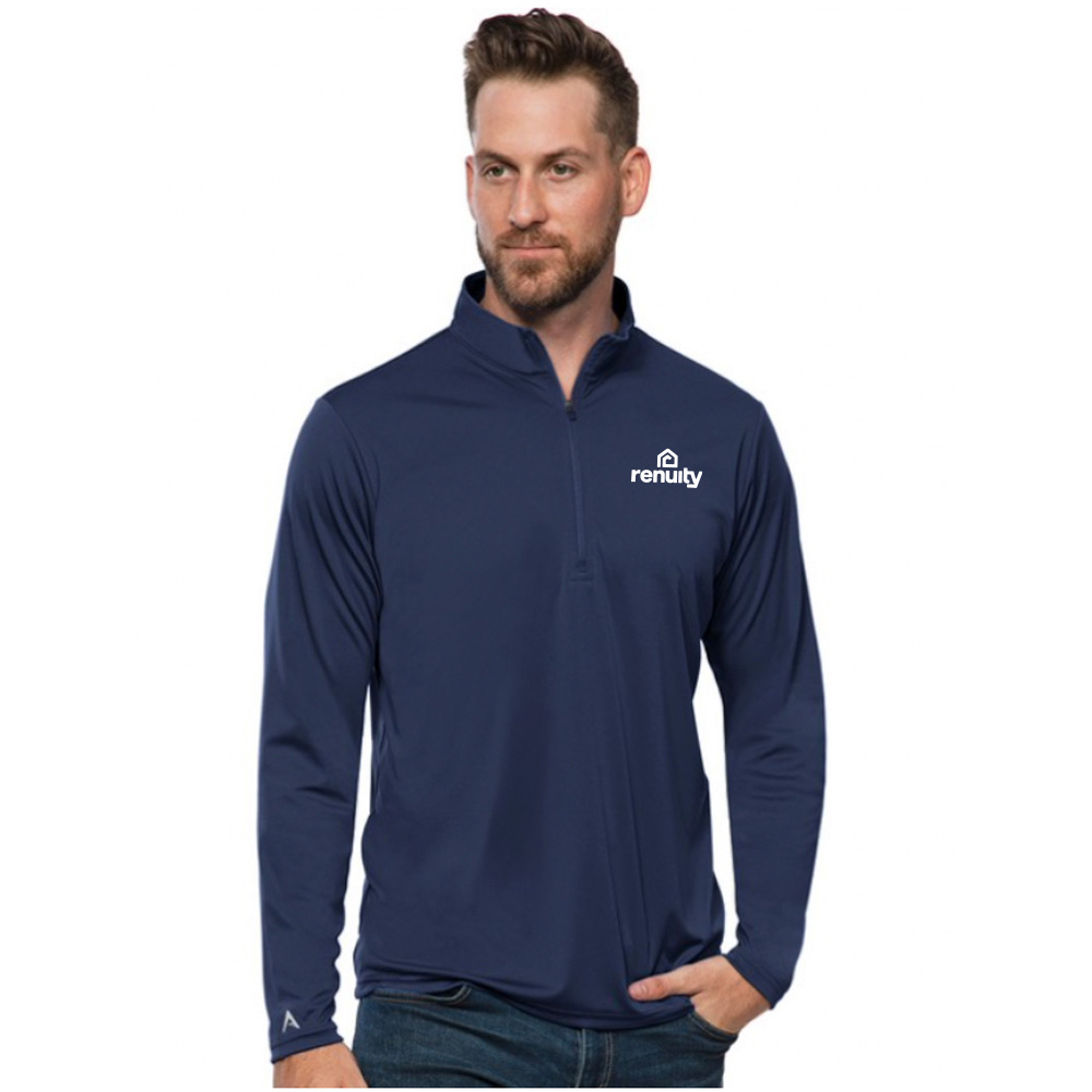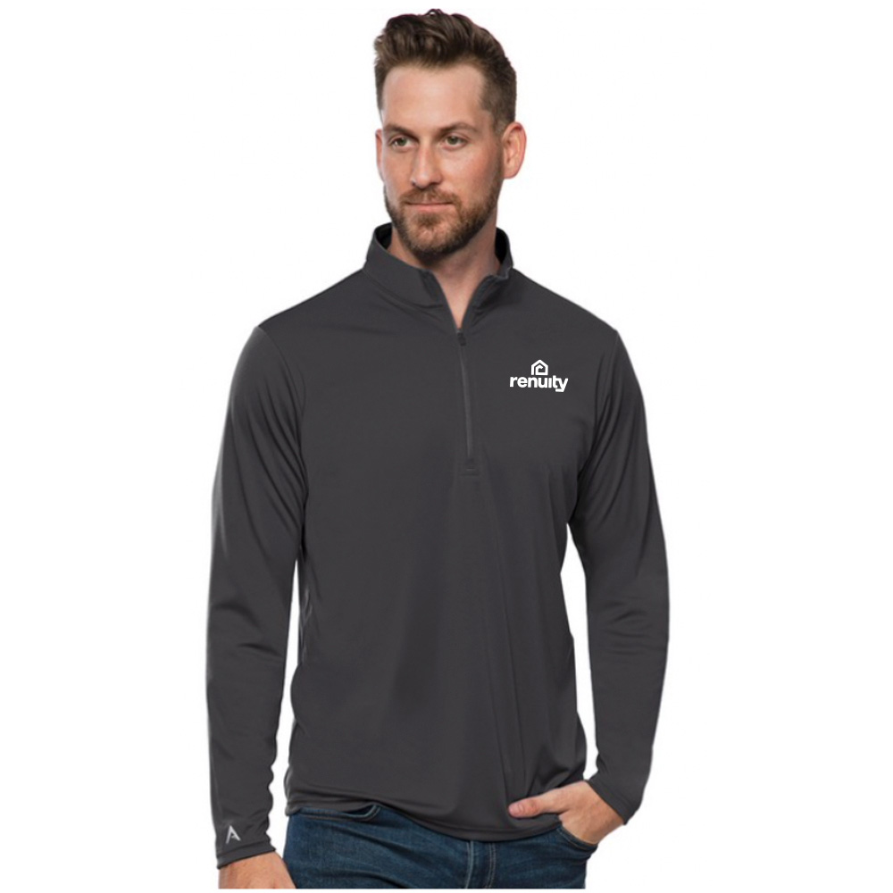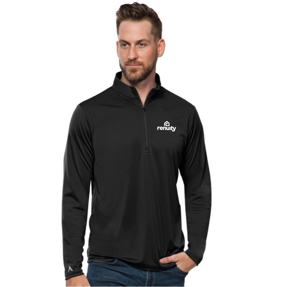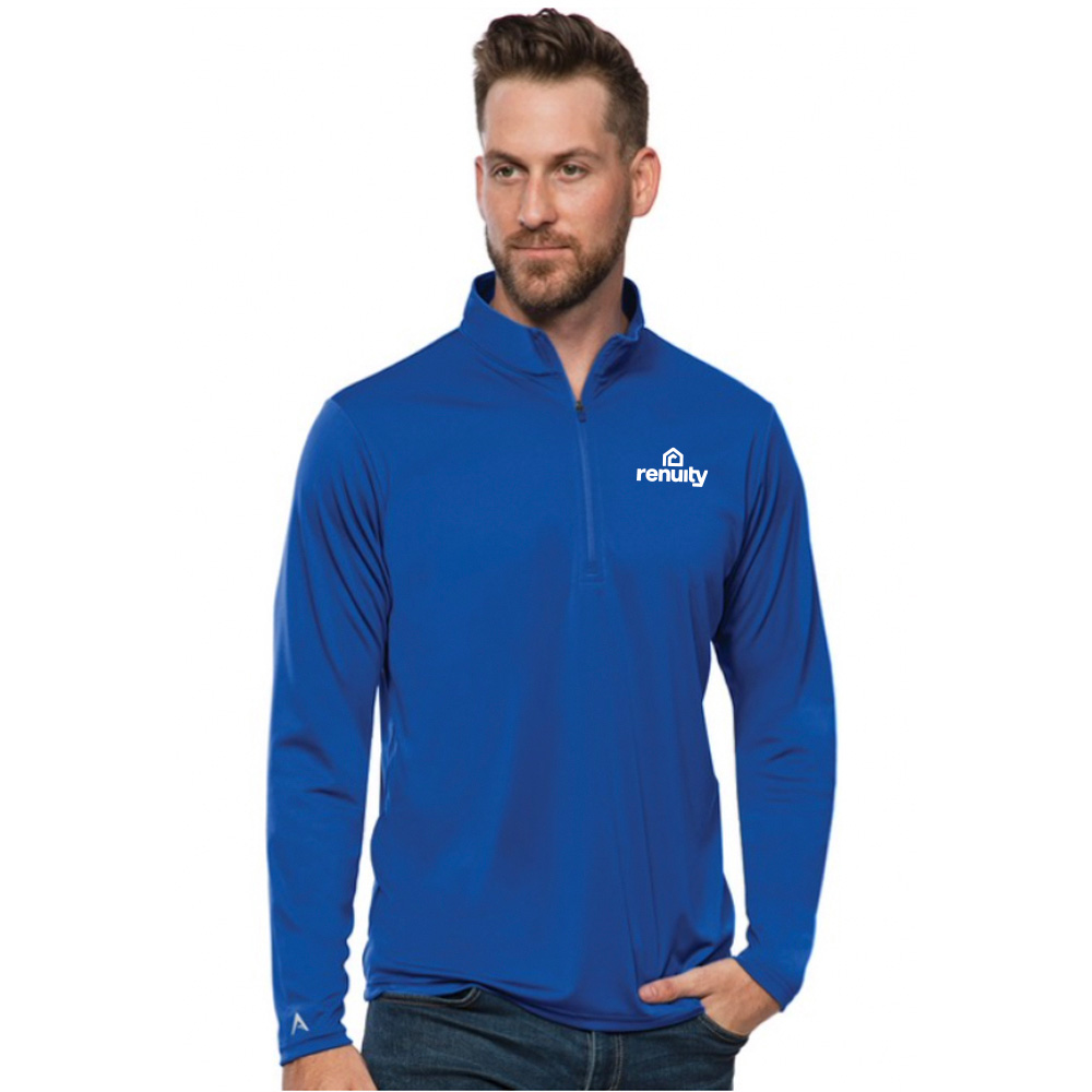 Lightweight pullover. 100% polyester. Interlock knit long sleeves. 1/4 zip pullover. Self fabric collar. Open cuff and bottom hem. Antigua triangle patch logo at right cuff.