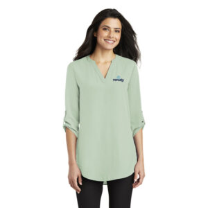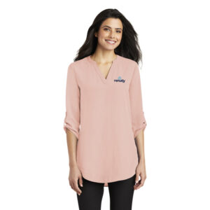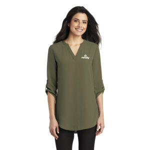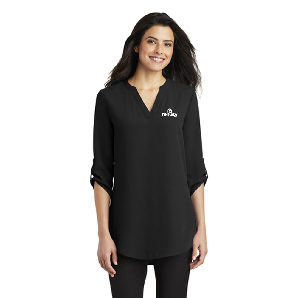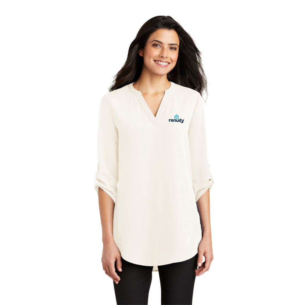 Transition seamlessly from professional life to play in this comfortable and flattering tunic blouse. 4.1-ounce. 100% Polyester crepe. Split V-Neck. Metal detail buttons on sleeves. Roll sleeves with button tabs. Longer tunic length. Gathered back detail